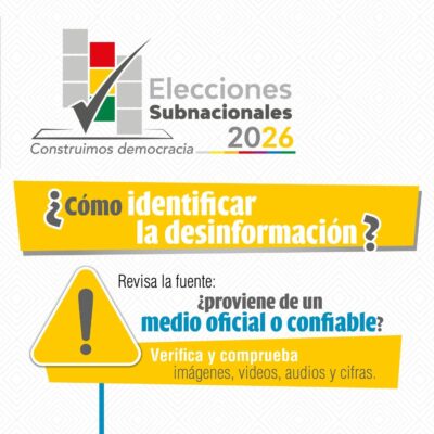 #TSEinforma I El Órgano Electoral Plurinacional, con el objetivo de fortalecer los conocimientos y capacidades en la identificación de noticias falsas que coadyuven al adecuado manejo de la información durante la elección de autoridades Políticas Departamentales, Regionales y Municipales, pone en conocimiento de la ciudadanía conceptos importantes como: ¿𝗤𝘂𝗲́ 𝗲𝘀 𝗹𝗮 𝗱𝗲𝘀𝗶𝗻𝗳𝗼𝗿𝗺𝗮𝗰𝗶𝗼́𝗻? 𝘆 ¿𝗖𝗼́𝗺𝗼 𝗶𝗱𝗲𝗻𝘁𝗶𝗳𝗶𝗰𝗮𝗿𝗹𝗮?