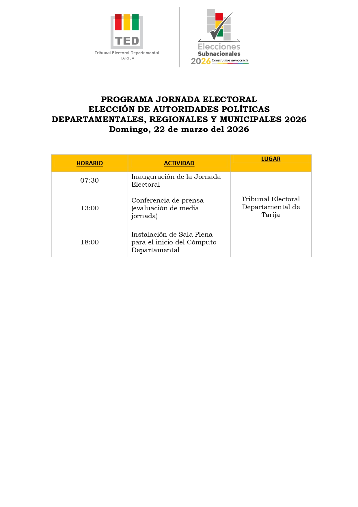 El Tribunal Electoral Departamental (TED) de Tarija dio a conocer el programa oficial de la jornada electoral para este domingo 22 de marzo de 2026, e